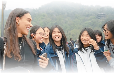 考察團(tuán)成員梅里頓(左一)在都江堰景區(qū)與當(dāng)?shù)貙W(xué)生交談。陳春安 攝